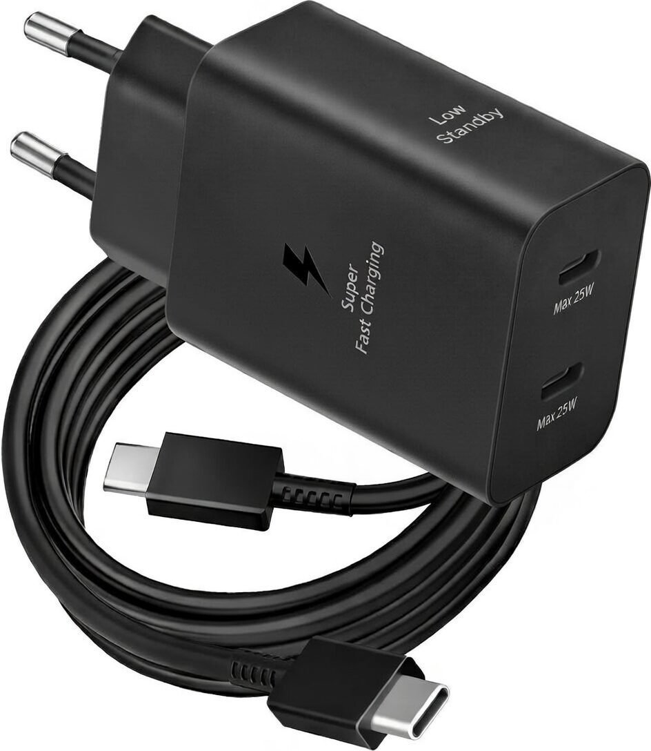 De Samsung 50W adapter is een krachtige en betrouwbare snellader voor je Samsung‑smartphone, tablet of andere compatibele apparaten. Met 50 watt vermogen laad je je apparaten snel en efficiënt op, zodat je minder tijd kwijt bent aan opladen en meer tijd hebt om te gebruiken wat je nodig hebt.